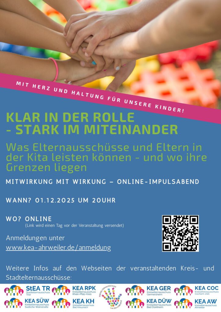 Der Kreiselternausschuss Bad Dürkheim (KEA DÜW) und acht weitere Kreis- und Stadtelternausschüsse aus Rheinland-Pfalz laden Sie herzlich zu einer Online-Veranstaltung ein. Unter dem Motto „Mit Herz und Haltung für unsere Kinder“ zeigen wir, wie Eltern gemeinsam mit Kita-Leitungen, Fachkräften und Trägern das Miteinander in der Kita gestalten und damit gute Bedingungen für die Kinder schaffen können.